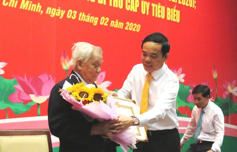 Phó Bí thư Thường trực Thành ủy TP.HCM Trần Lưu Quang trao Huy hiệu 60 năm tuổi Đảng cho đảng viên cao tuổi Đảng. Ảnh: TÁ LÂM