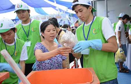 Hoạt động đổi chất thải nguy hại lấy quà tại Ngày hội Tái chế chất thải năm 2014. Ảnh: NGỌC CHÂU