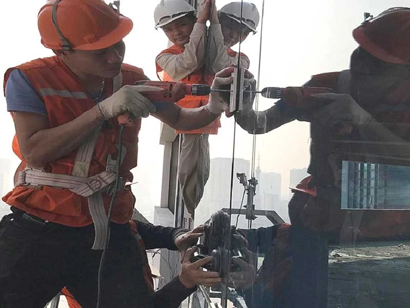 Công nhân đang thi công lắp đặt kính cho một tòa nhà. Ảnh: Q.HUY
