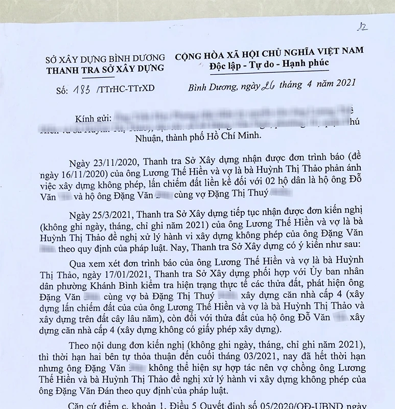Ngày 26-4-2021, Thanh tra Sở Xây dựng tỉnh Bình Dương đã ban hành văn bản thông báo về kết quả giải quyết đơn của vợ chồng bà Thảo.