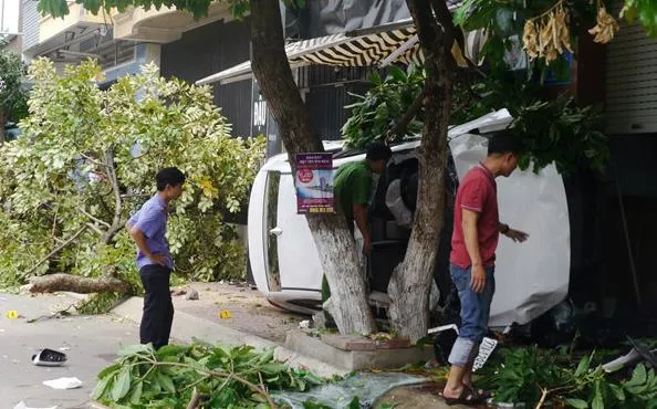 Chiếc xe bốn chỗ bay lên vỉa hè, nằm kẹt giữa một cây xanh và vách nhà. Ảnh: HT
