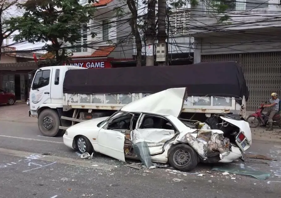 Thời điểm xe con ra làn ngoài thì thình lình va chạm với container 34C-110.22 từ phía sau vọt lên. Hậu quả, xe biển xanh bị kẹp giữa hai phương tiện lớn khiến hư hỏng nặng, nóc xe và cốp sau bị vỡ tung, móp méo, nhiều bộ phận biến dạng.