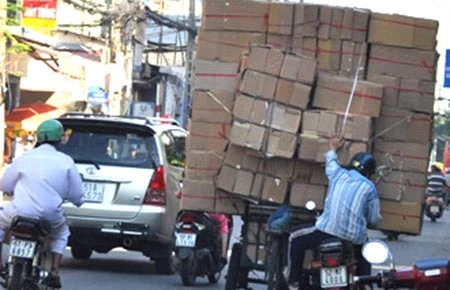 Điều đáng nói là số hàng hóa này chỉ buộc bằng những sợi dây nylon nhỏ xíu. Người đàn ông chạy xe lúc thì ngồi sau đạp đi, lúc thì tới trước kéo đồng thời được một người đi xe máy khác hỗ trợ bằng cách vừa lái xe máy vừa dùng chân đẩy. Nhiều người lưu thông bên cạnh hoảng hốt tránh xa chiếc xe ba gác này. Anh Nguyễn Văn Hiếu (nhà ở đường Âu Cơ) cho biết: “Tôi không thể nghĩ rằng một chiếc xe nhỏ vậy mà chở hàng như thế. Chở kiểu này mà hàng hóa rơi xuống đường thì người tham gia giao thông sẽ bị vạ lây”.