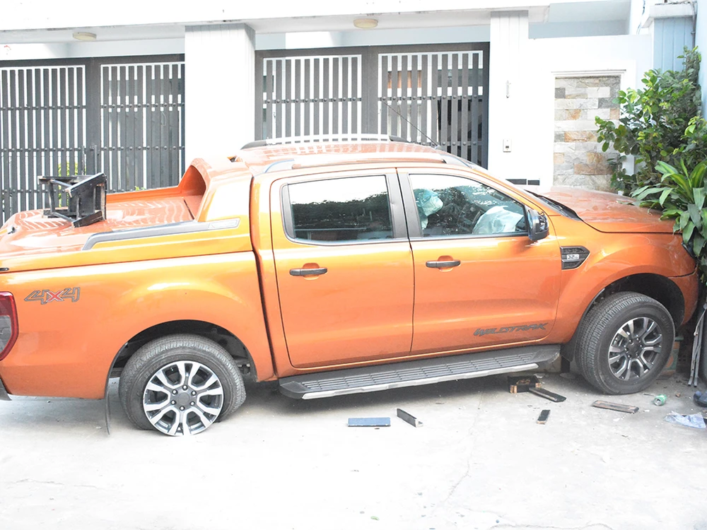 Chiếc xe bán tải chỉ dừng lại sau khi tông trúng bức tường của nhà dân. Ảnh: H.Tâm