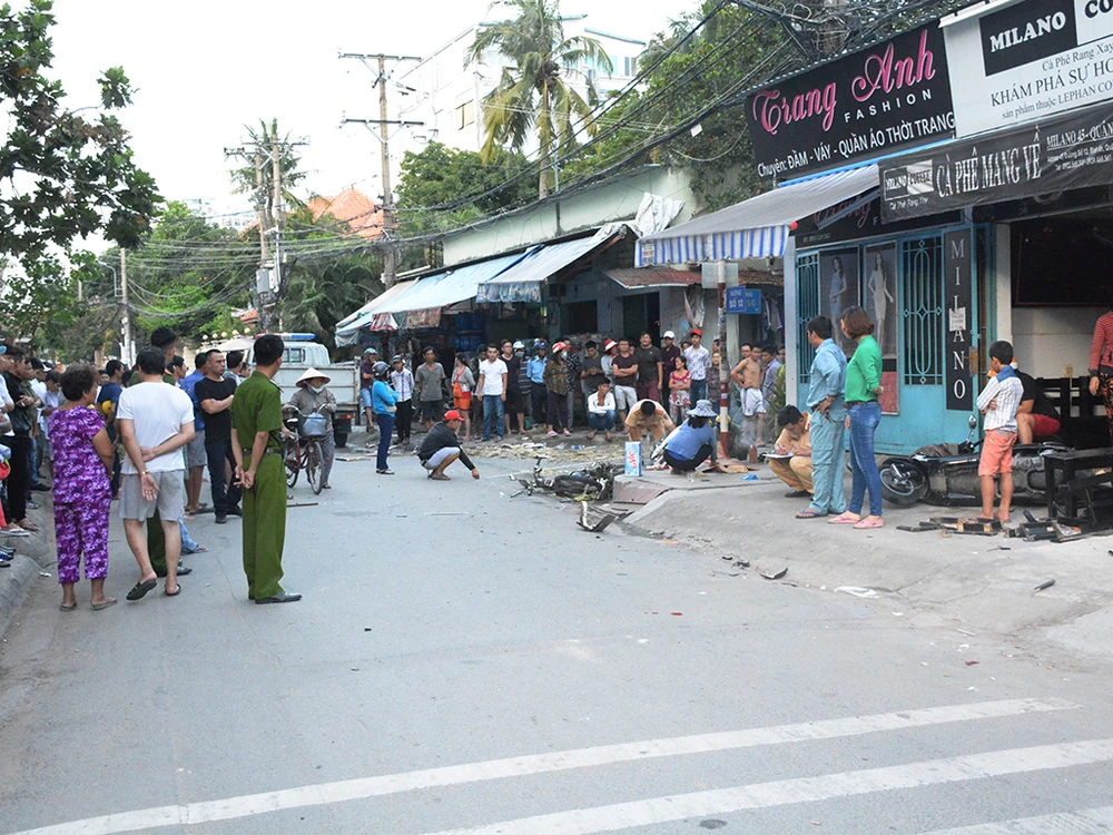 Khi đến gần giao lộ đường số 12 - đường số 14 (phường Bình An, quận 2) thì bất ngờ bị nổ lốp. Chiếc xe lao thẳng lên vỉa hè tông trúng người phụ nữ tên H. (33 tuổi, ngụ quận 2) đang giao nước đá cho quán giải khát.