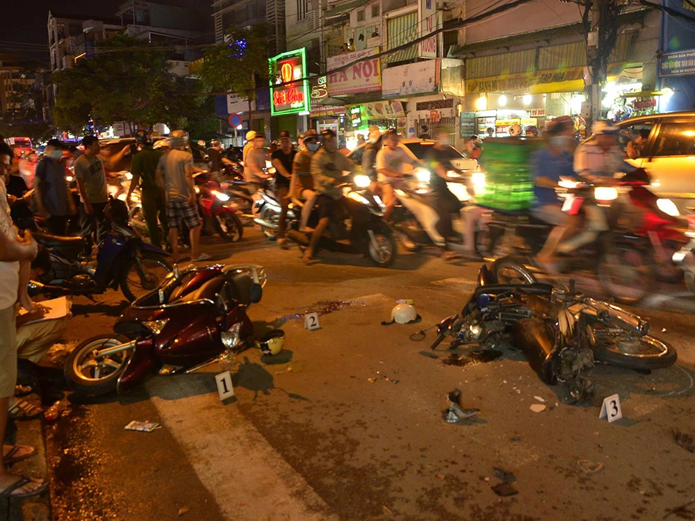 Hiện trường vụ va chạm la liệt xe máy. Ảnh: H.Tâm