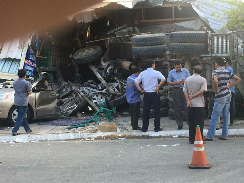 Tuy nhiên, xe bất ngờ lao thẳng sang bên kia đường, đâm mạnh vào bốn xe máy và một ô tô bảy chỗ đang đậu trước cửa quán. Xe chỉ dừng lại khi lật nghiêng, dụng vào cửa quán ăn.