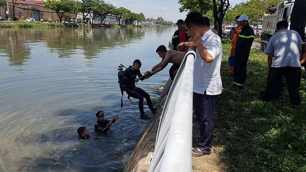 Do thời điểm này, nước trên kênh còn thấp, tài xế may mắn không bị thương nặng nên đạp cửa chui ra ngoài cầu cứu.