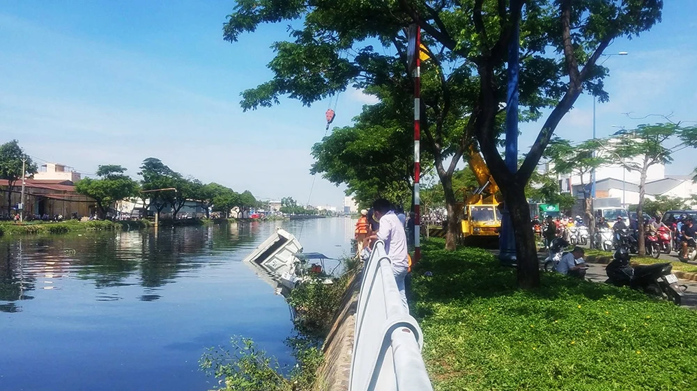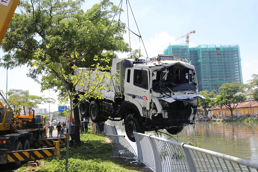 Chưa dừng lại, xe ben tiếp tục lao qua làn xe máy, leo lên lề tông gãy một cây xanh, húc sập thêm dải lan can bảo vệ kênh rồi lao thẳng xuống kênh Tàu Hủ.