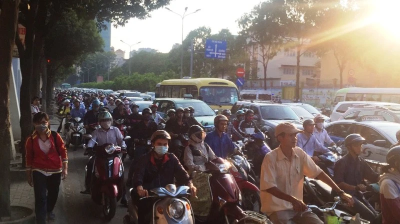 Các tuyến đường như Tôn Đức Thắng, Nguyễn Hữu Cảnh, Nguyễn Bỉnh Khiêm ùn tắc, hàng ngàn phương tiện nối đuôi nhau nhích từng chút một.