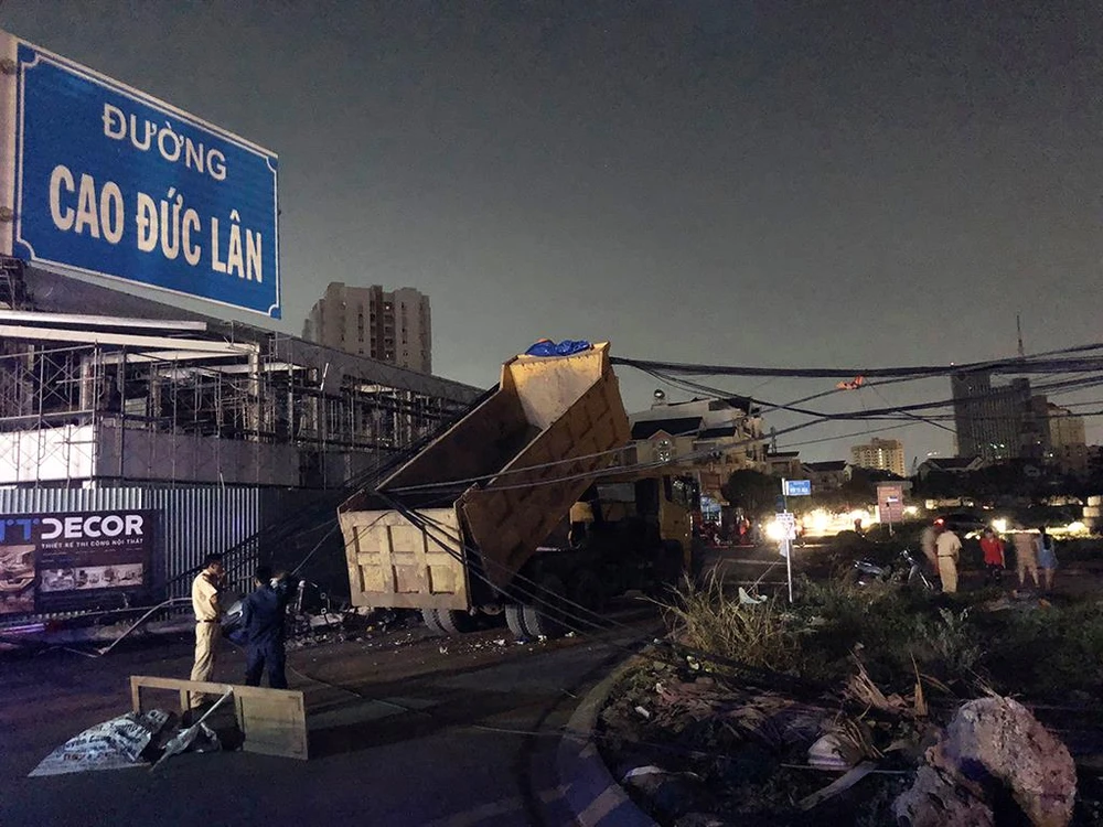 Trước đó, tài xế Phạm Tuấn Lợi điều khiển xe ben lưu thông từ đường Lương Định Của vào khu đô thị An Phú. Khi vừa qua giao lộ với đường Cao Đức Lân thì thùng xe do chưa được hạ đã vướng vào hệ thống dây cáp viễn thông.