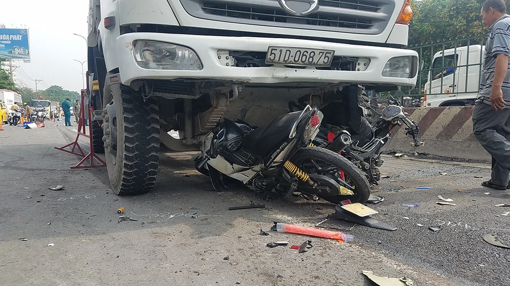 Tại hiện trường, bốn xe máy của các công nhân bị xe ben tông trúng, trong đó hai xe máy bị cuốn vào gầm biến dạng. Khung cảnh tan hoang, nhiều mảnh vỡ văng khắp nơi.
