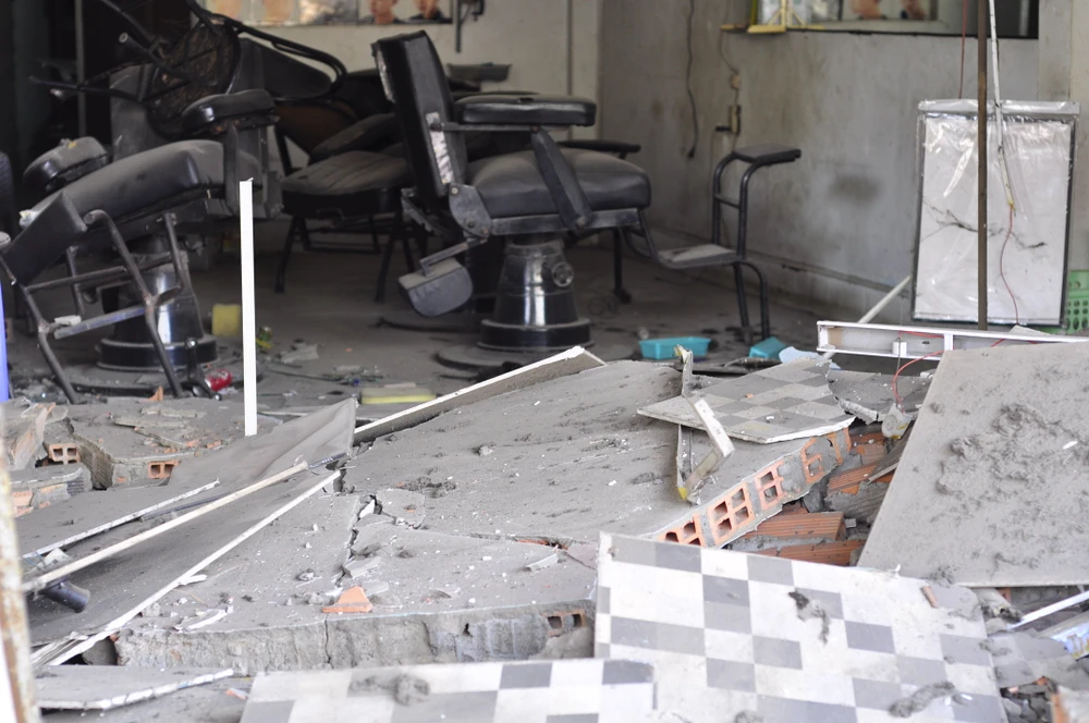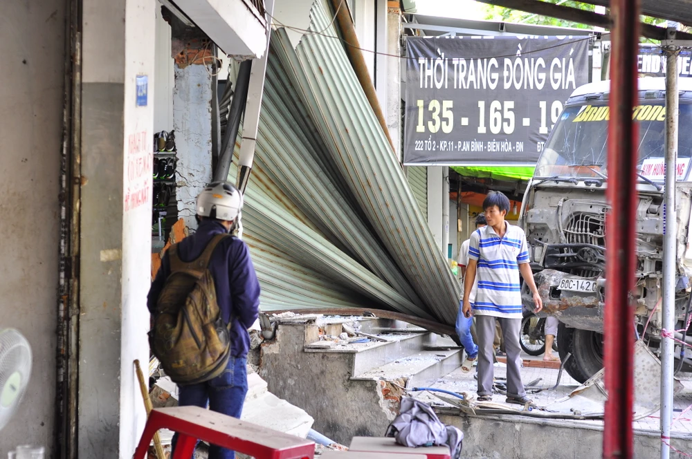 Chiếc xe ben gây tai nạn tiếp tục lao về phía trước, chuyển hướng phải rồi đâm vào hai ô tô mang biển số 60V-9304 và 51C-814.86 chạy cùng chiều rồi đâm sập ba ki-ốt mới chịu dừng lại.