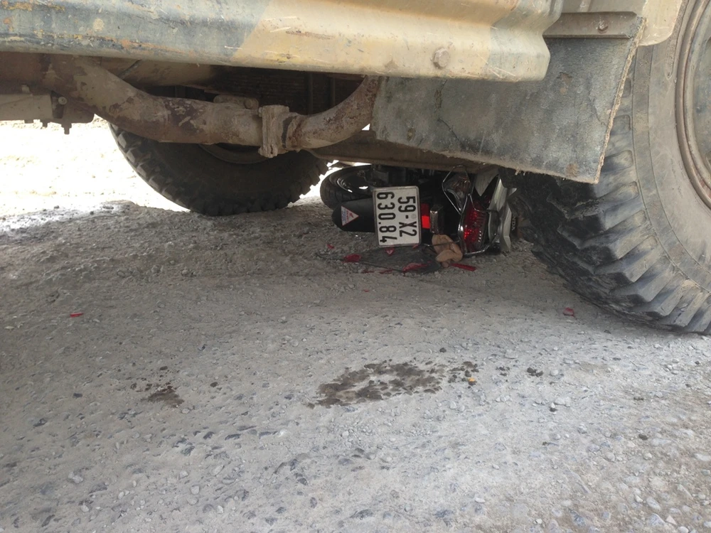 Cú va chạm mạnh khiến chiếc xe máy cùng người phụ nữ lọt vào bên trong gầm xe ben và bị kéo đi khoảng 2m.