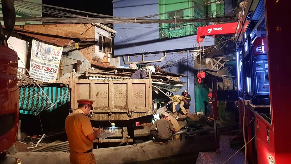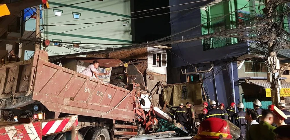 Chiếc xe ben bất ngờ mất lái tông thẳng vào ngôi nhà đồng thời là tiệm hủ tiếu ở dốc cầu Chánh Hưng. Ảnh HT.