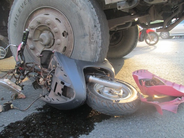 Chiếc xe máy bị bánh trước xe ben đè ngang gãy nát.