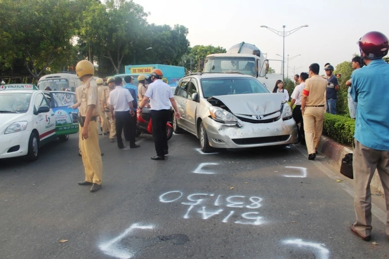 Chiếc xe bồn đã tông vào đuôi xe taxi BKS: 56M-0771 đẩy xe taxi lao tới tông vào đuôi xe bảy chỗ BKS: 51A-114.58 khiến chiếc xe bảy chỗ lao tới tông vào một xe bảy chỗ khác BKS: 51A-831.50 đang dừng phía trước chờ đèn đỏ tạo thành vụ va chạm liên hoàn.
