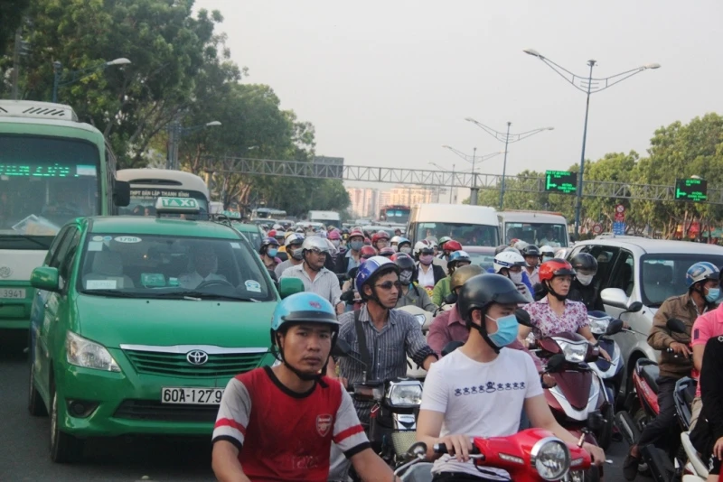 Vụ tai nạn khiến tuyến đường Trường Chinh vào trung tâm thành phố bị ùn ứ cục bộ, hàng ngàn phương tiện nối đuôi nhau nhích từng phân một.