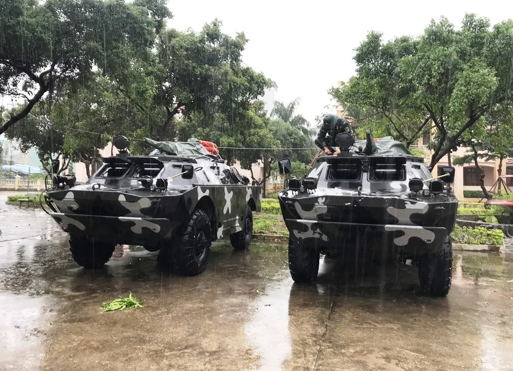 Xe bọc thép chuẩn bị ứng phó trong bão. Ảnh: HẢI HIẾU