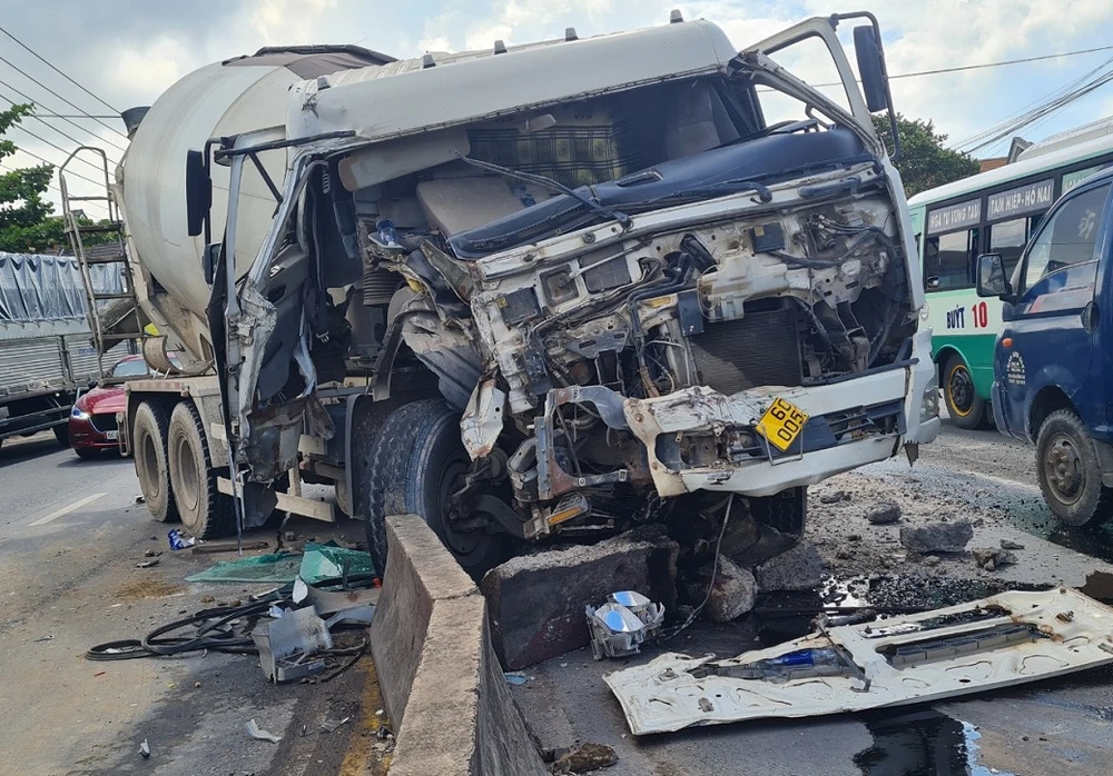 Sau cú va chạm mạnh, chiếc xe bồn tiếp tục lao vào dải phân cách cứng bằng bê tông trên đường mới dừng lại.