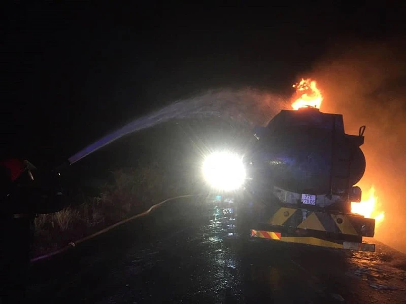Ngọn lửa lây lan bao trùm chiếc xe bồn này. Tài xế xe bồn may mắn thoát khỏi xe nhưng bị thương nhẹ và được người dân đưa đi cấp cứu.
