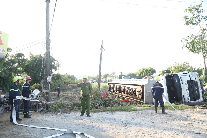 Đến 11 giờ sáng 19-9, lực lượng Cảnh sát Phòng cháy và chữa cháy tỉnh Thừa Thiên - Huế vẫn đang phối hợp với Công an tỉnh này khoanh vùng bảo vệ hiện trường và tiếp tục xử lý sự cố, phòng ngừa cháy nổ xảy ra đối với xe bồn chở dung môi bị lật tại đường tránh QL 1 qua TP Huế.