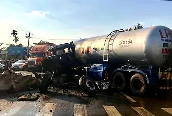 Xe bồn bị hư hỏng nặng, rất may số gas trong bồn không bị rò rỉ ra ngoài. Ảnh: Bạn đọc cung cấp