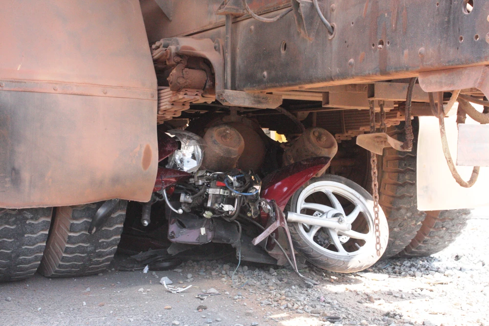 Chiếc xe máy của nạn nhân bị cuốn vào gầm.