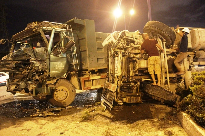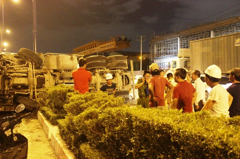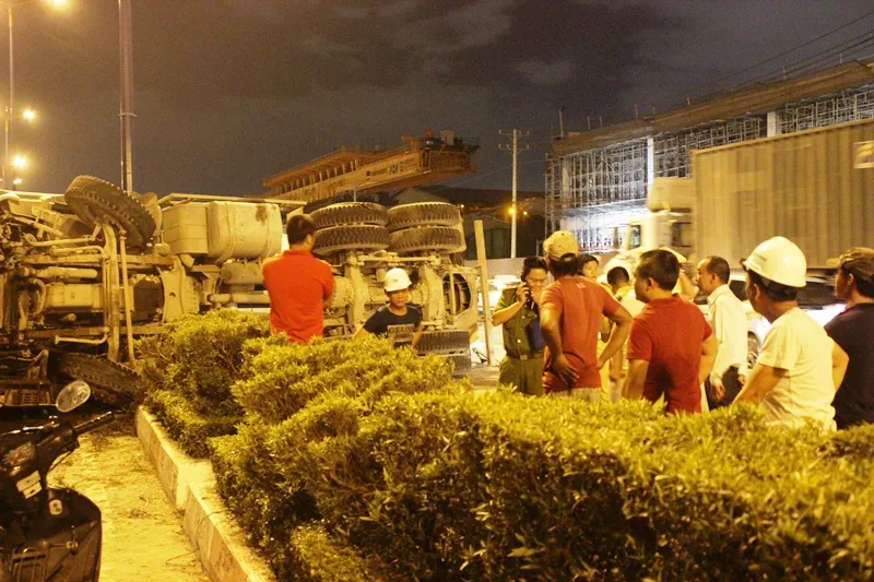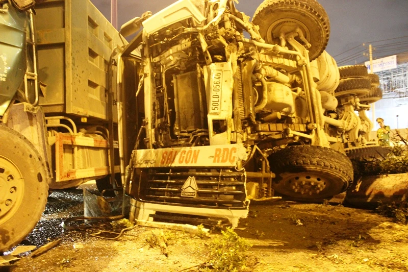 Tại hiện trường, chiếc xe bồn bị lật nghiêng, phần đầu móp méo, dầu nhớt và nhiều bộ phận văng tung tóe, xi măng lỏng trong xe bồn cũng chảy ra ngoài. Giao thông qua khu vực bị ùn ứ nghiêm trọng.