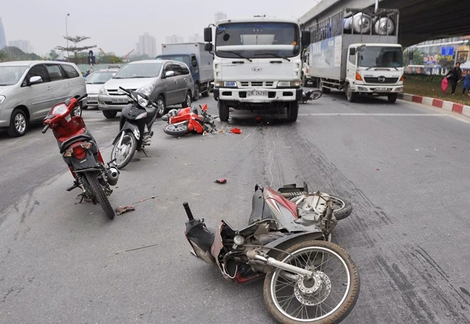 Hiện trường vụ tai nạn xe bồn chở xăng mất phanh đâm hàng loạt xe máy trên đường Khuất Duy Tiến sáng 4/1.