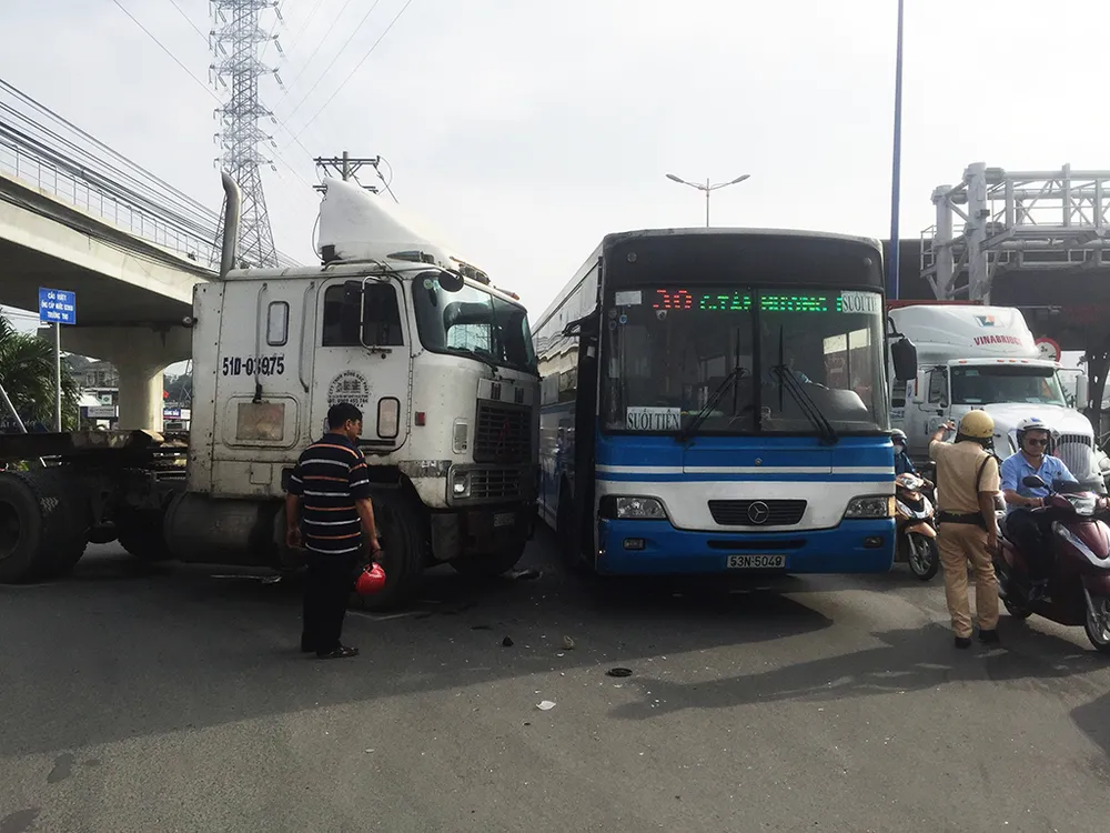 Khi chuẩn bị qua trạm thu phí (phường Trường Thọ, quận Thủ Đức, TP.HCM) thì bất ngờ va chạm với xe container biển số TP.HCM đang chạy từ đường Nguyễn Văn Bá ra xa lộ Hà Nội.