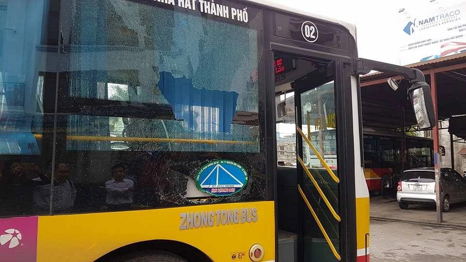 Chiếc xe buýt của công ty Cổ phần đường bộ Hải Phòng bị đập vỡ kính khi chuẩn bị vào bến