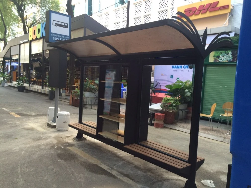 Cạnh xe buýt sách, khách tham quan đường sách TP.HCM được chiêm ngưỡng và đọc sách ngay tại trạm chờ “tri thức”, được trang bị kệ sách, băng ghế gỗ, mái che thiết kế theo hình trang sách.