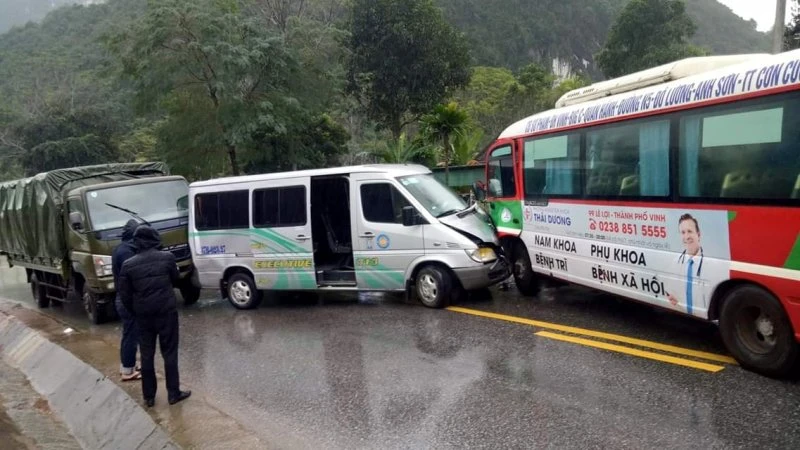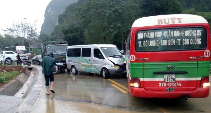 Vào thời điểm trên trời có mưa, mặt đường trơn, xe buýt Khanh Quỳnh 37B-013.76 chạy tuyến nội thành TP Vinh (Nghệ An), huyện miền núi Con Cuông (Nghệ An) tông nhau với xe khách 37B-023.27 chạy ngược chiều. Xe tải mang biển số màu xanh chạy sau đâm vào đuôi xe khách 37B-023.27 khiến cả ba xe dính liền nhau, chắn hết mặt đường.