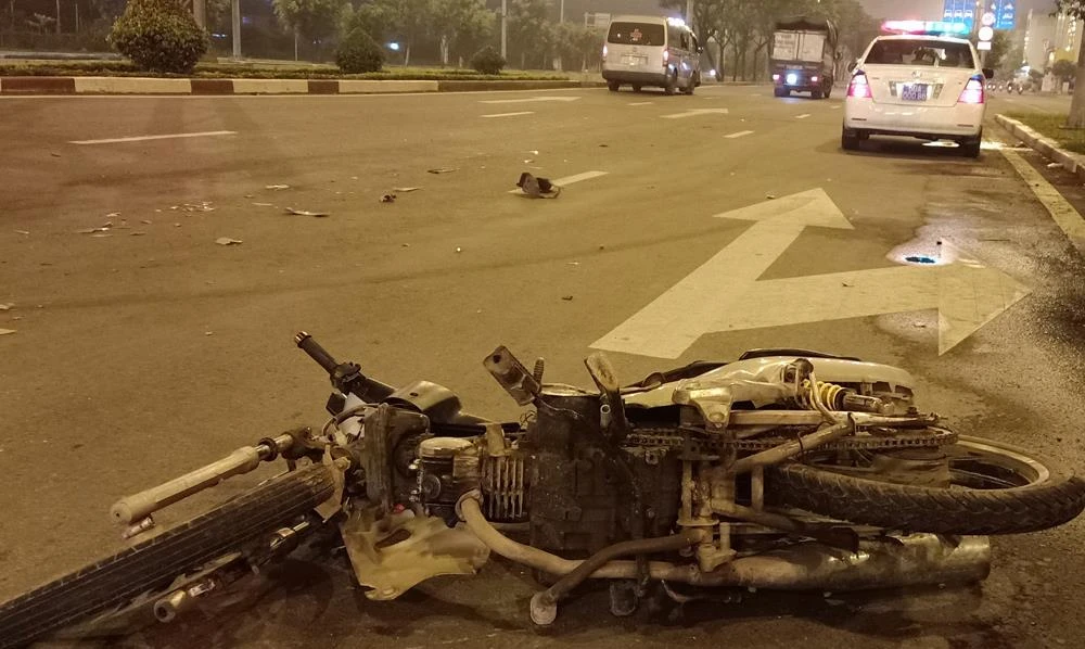 Sau cú va chạm, xe máy nằm ở làn đường dành cho xe ô tô, phần đầu xe máy biến dạng hoàn toàn. Xe cấp cứu tiếp tục di chuyển hơn 50 mét mới ngừng hẳn. Hai thanh niên bị thương được người dân đưa cấp cứu.