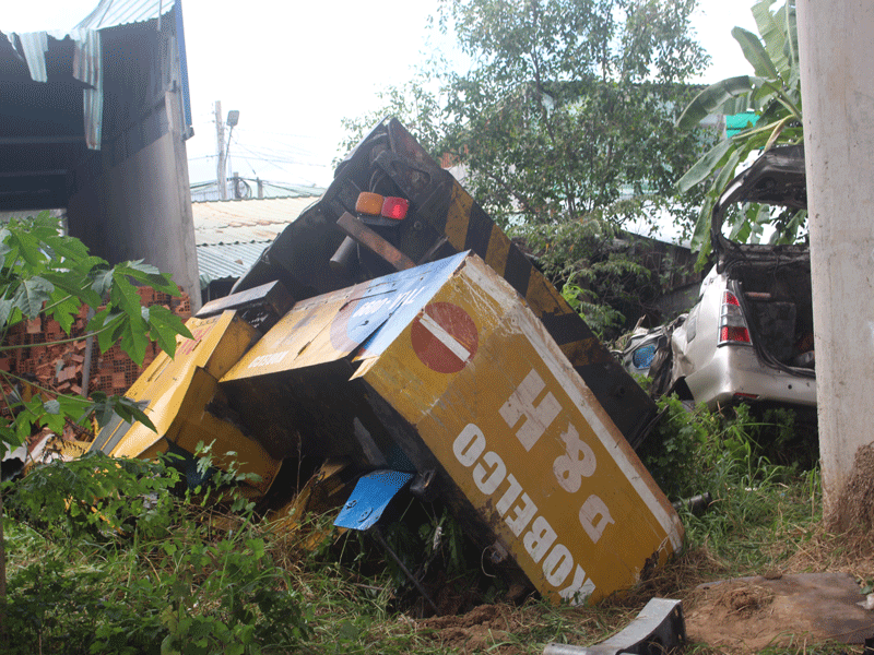 Tại hiện trường xe cẩu bị lật nhào, chiếc 7 chỗ bị chiếc xe cẩu đè lên khiến phương tiện hư hỏng hoàn toàn.