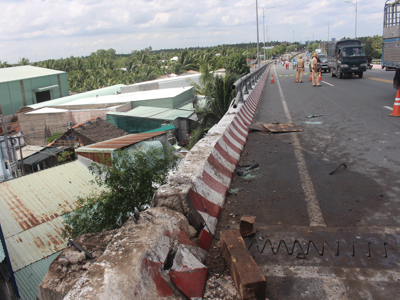 Thành cầu Hàm Luông đã bị tông sập hoàn toàn sau vụ tai nạn.