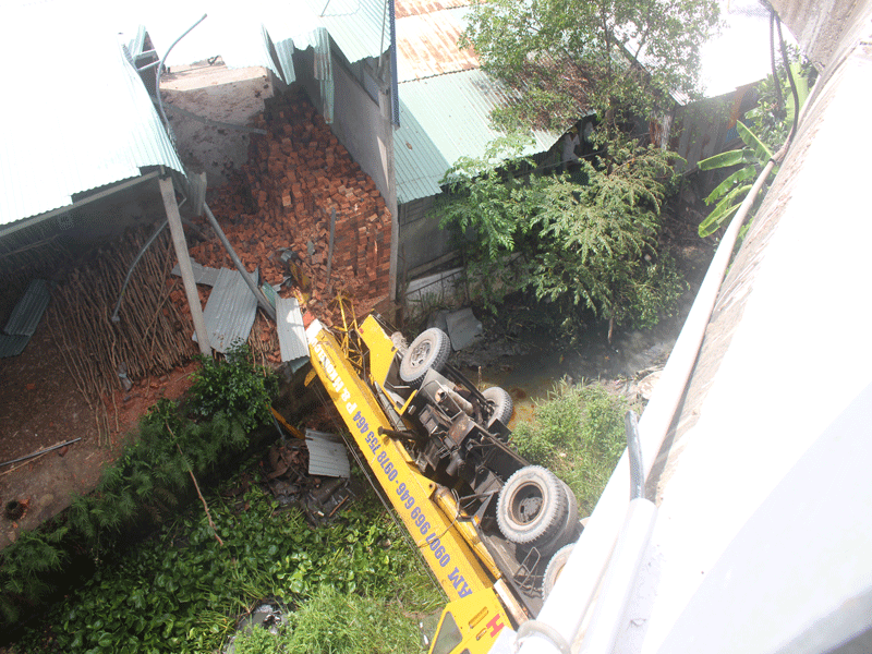 Xe cẩu bị rơi xuống kênh nước.