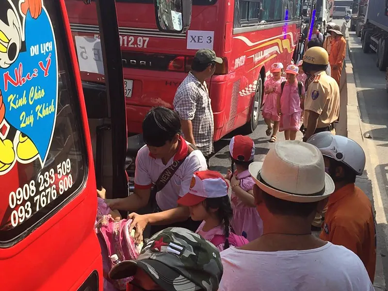 Nhận được thông tin, lực lượng chức năng đã nhanh chóng có mặt giải quyết vụ việc. Các em được chuyển sang xe khác để tiếp tục hành trình.