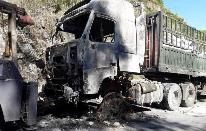 Đầu kéo chiếc xe cháy trơ khung sắt.