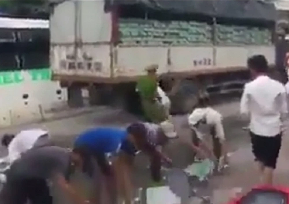 CSGT cùng người dân nhặt bia giúp tài xế xe tải. (Ảnh cắt từ clip)