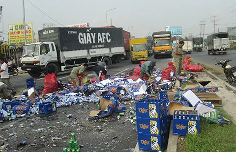 CSGT và lực lượng dân phòng địa phương phối hợp với người dân bảo vệ hiện trường và cùng tài xế nhanh chóng thu dọn số bia rơi trên đường cho nhà xe. Một số người đi đường hiếu kỳ đứng lại xem, không xảy ra hiện tượng “hôi” bia.