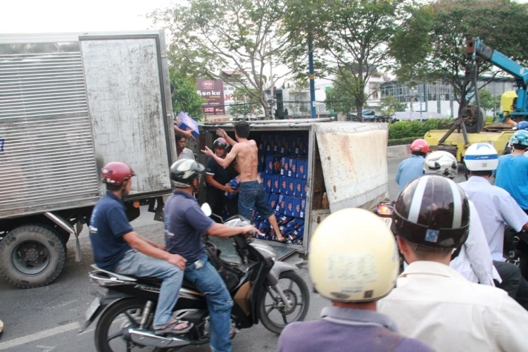 Theo những người chứng kiến, chiếc xe tải nhỏ chở theo hàng trăm thùng bia, khi mất lái đã tự động nghiêng đổ.