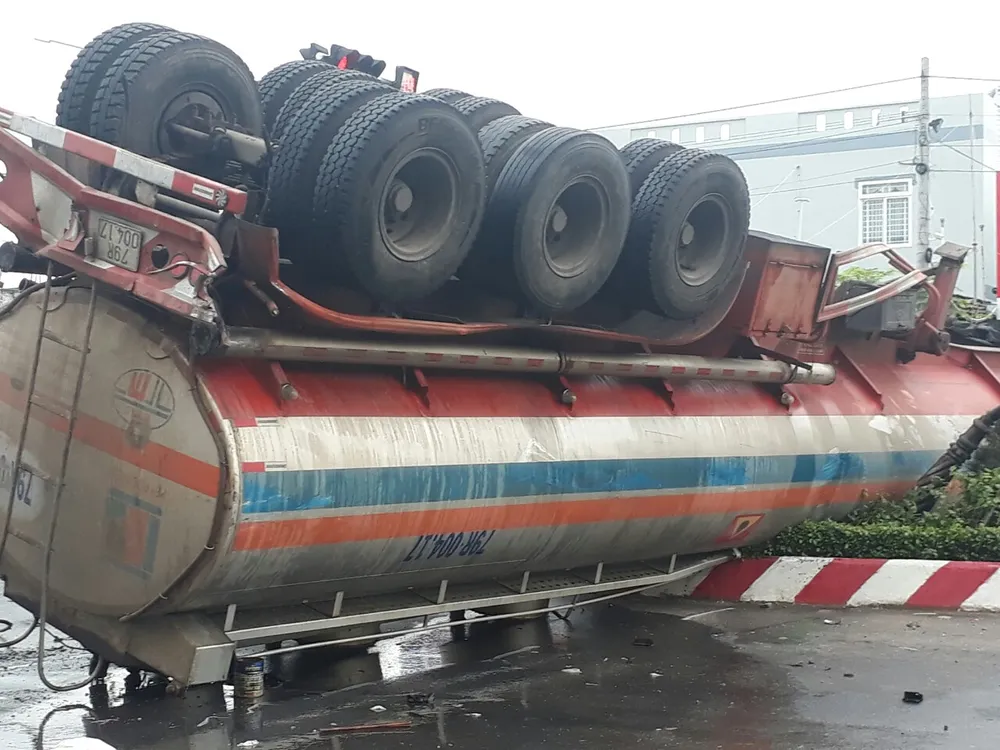 Hậu quả, xe chở dầu bị đâm vào trụ đèn giữa con lươn đường lật ngửa khiến dầu trong bồn đổ tràn xuống đường. Xe đông lạnh cũng bị hư hỏng, một người trên xe bị thương.