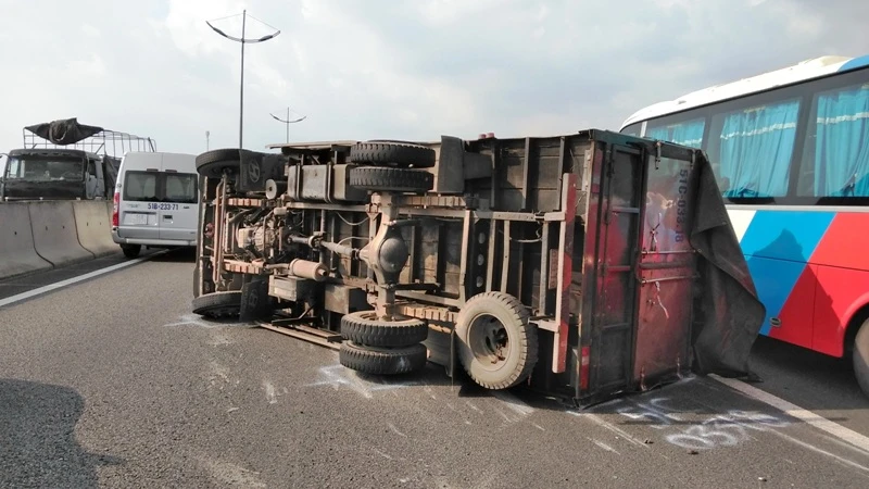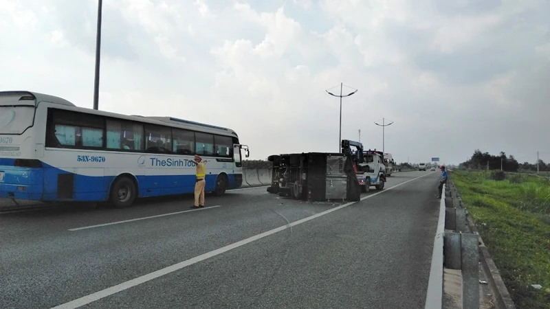 Theo người dân có mặt tại hiện trường vụ tai nạn cho biết, khoảng 15 giờ chiều 27-5, ô tô tải 51C-033.18 do tài xế Đinh Nhật Tân (ngụ huyện Châu Thành, Bến Tre) điều khiển chở dừa trên cao tốc TP.HCM-Trung Lương, theo hướng đi từ Tiền Giang về TP.HCM.