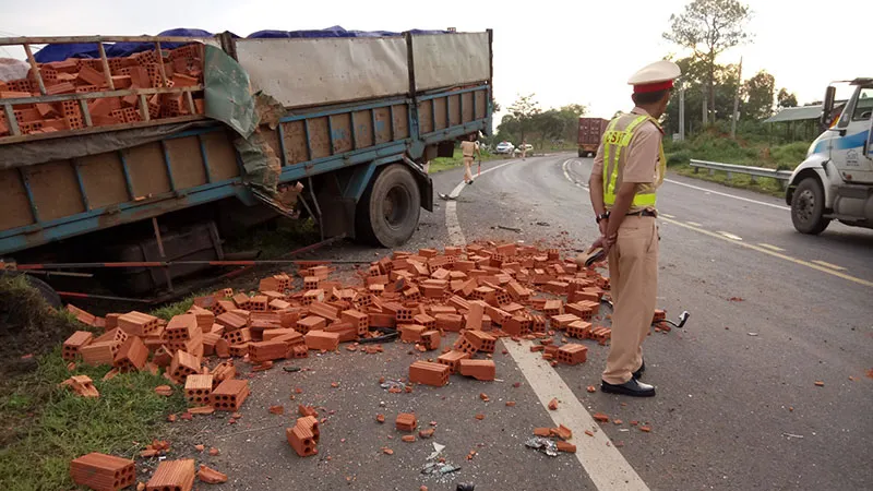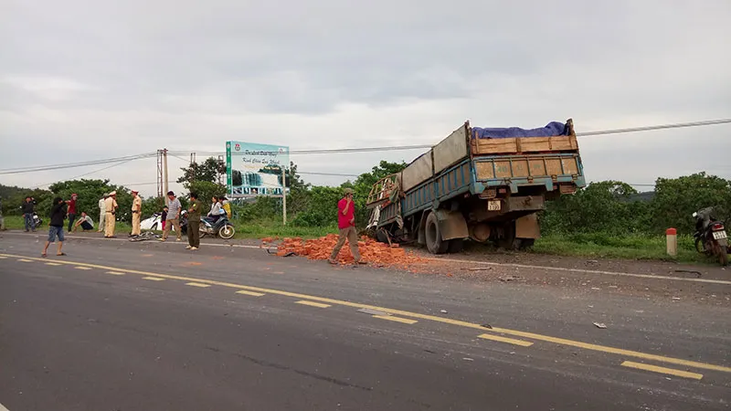 Lúc này, chiếc ô tô biển số 79A-4489 (chưa rõ danh tính tài xế) chạy cùng chiều với xe chở gạch bị xe chở gạch tông, hất văng rơi xuống ta luy đường.