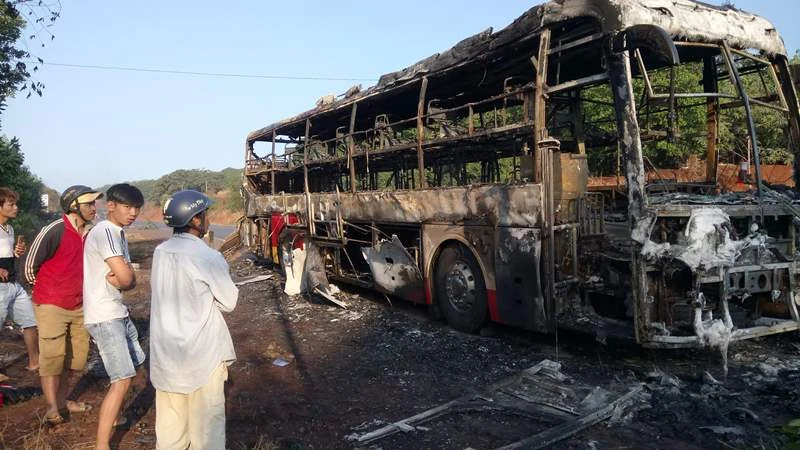 Lửa bùng cháy thiêu rụi hoàn toàn chiếc xe. Tại hiện trường xe khách chỉ còn trơ lại bộ khung.