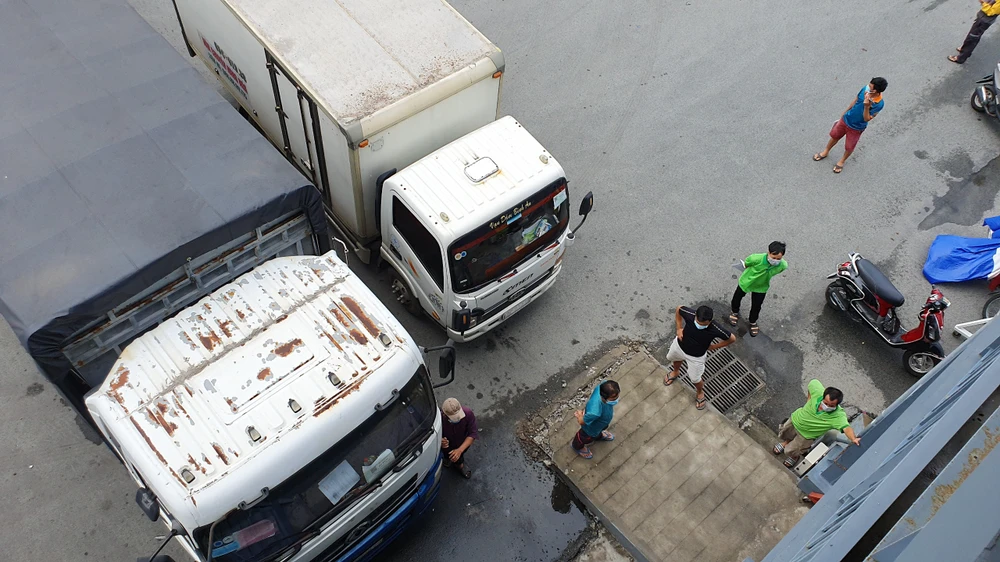 Trong khi dòng xe hàng hoá vẫn nối đuôi nhau di chuyển vào điểm tập kết