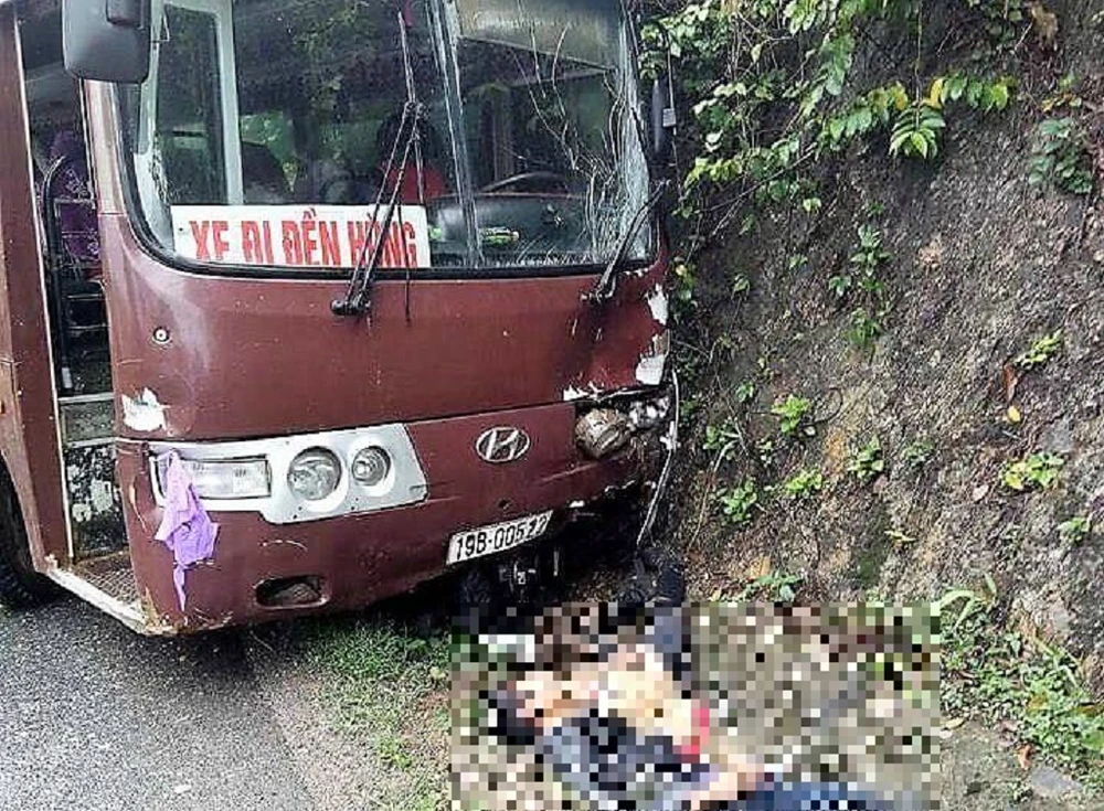Hậu quả vụ va chạm khiến hai nam thanh niên đi xe 21B1-756.00 bị thương nặng. Tại hiện trường, chiếc xe khách bị hư hỏng phần đầu vì đâm vào vách núi sau va chạm. Xe máy 21B1-756.00 bị xe khách cuốn vào gầm, hư hỏng nặng. Hai thanh niên trên chiếc xe này nằm bất tỉnh ở rãnh thoát nước bên đường.