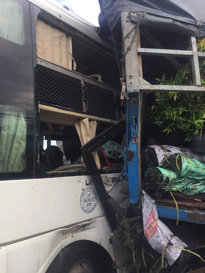 Sau cú tông, phần đầu xe khách giường nằm dính chặt vào đuôi xe tải. Hơn 30 khách du lịch trên xe khách đập cửa kính thoát ra ngoài.